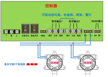 1.气体探测器采用两线通讯,信号无极性设计。强负载信号既是通信信号也是供电信号,通讯能量强,抗干扰好。产品安装接线只需要一根两芯线,所有探测器以串联方式并入电路内,接线不用区分正负极,正反接都能保证正常使用。