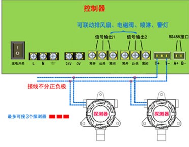 甲醛浓度报警器控制主机安装在值班室(或办公室),气体探测器安装在检测现场,当现场气体浓度达到预设报警点时,气体探测器给气体报警控制器一个信号,启动声光报警功能,开启排风扇或电磁阀。